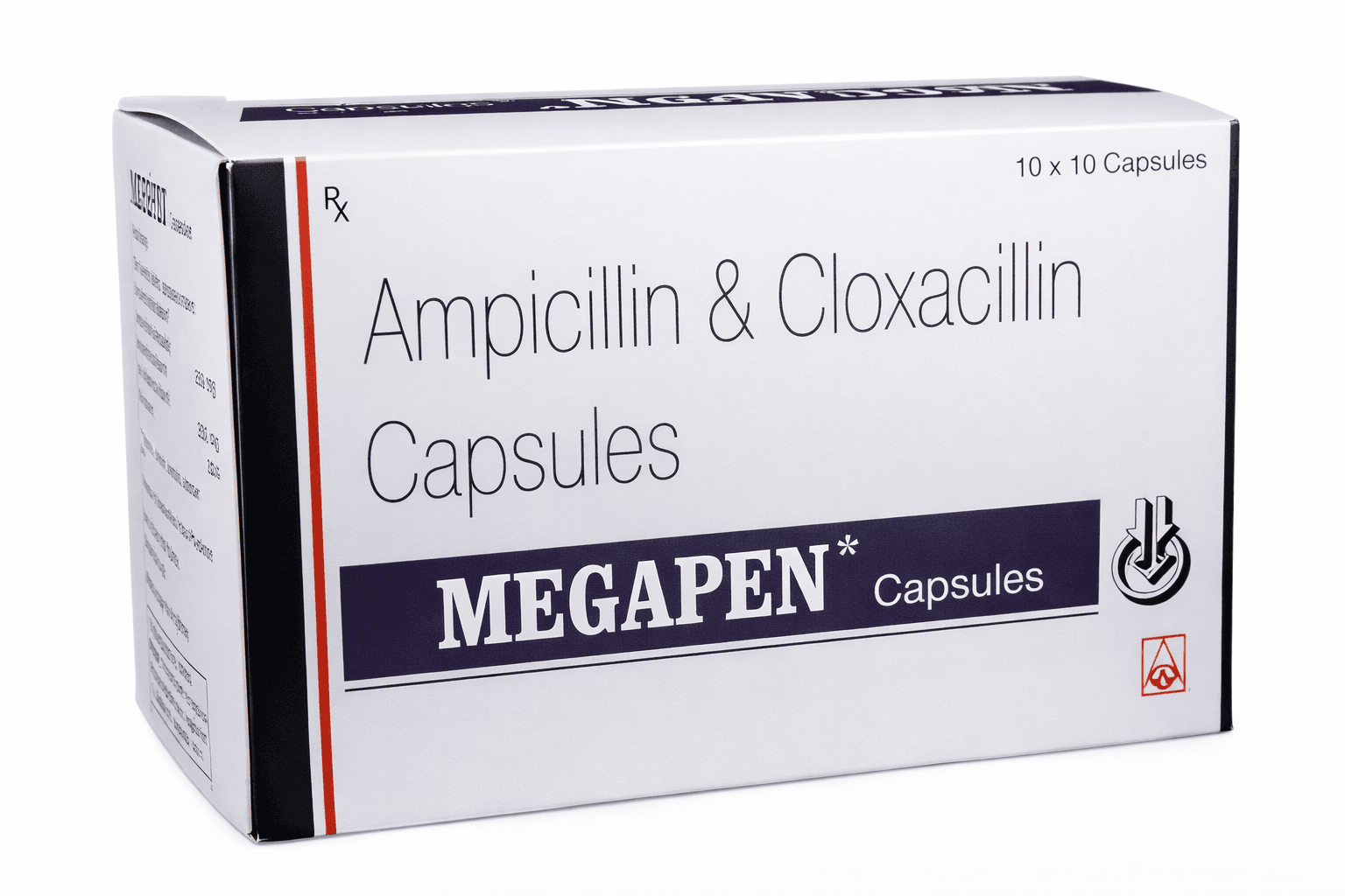 Megapen (Ampicillin / Cloxacillin) is a combination antibiotic used to treat a wide range of bacterial infections, including respiratory, skin, soft tissue, and urinary tract infections. It works by inhibiting bacterial cell wall synthesis, helping eliminate susceptible bacteria effectively.